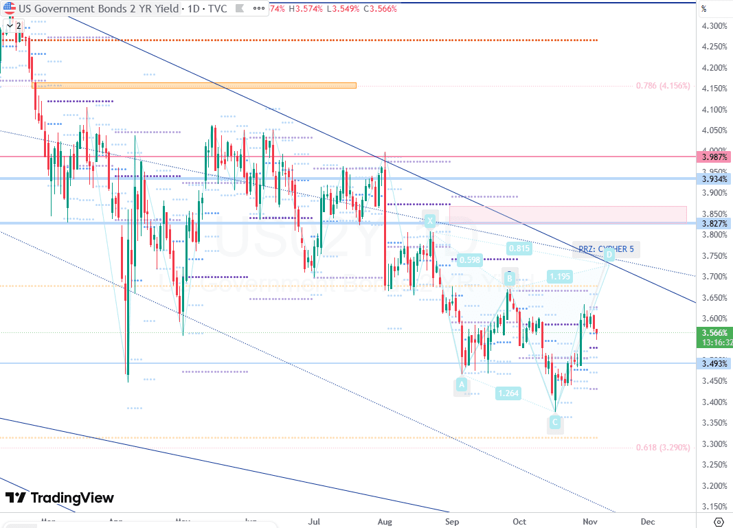こちらは2年金利のチャート。描画しているサイファーパターンを形成する可能性がありますが、その場合、形成後の動きの方が重要そうです。逆に今の地点から、短期的に上昇した後に下落してくる場合、3.290%から3.313%あたりまでが最初のターゲットになりそうですね。