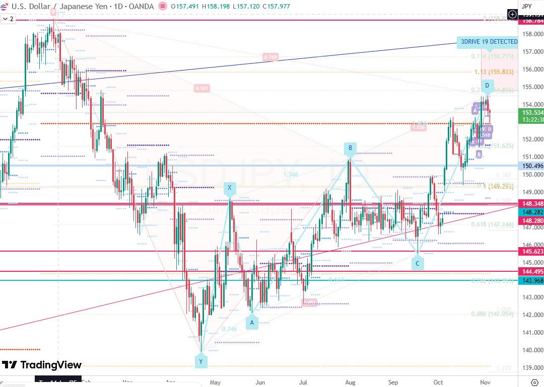 USDJPY multiple harmonic patterns 5 Nov 2025前回シェアしていた長期足のブリッシュな5-0パターンと移動平均線、濃紺のチャネルの上限ラインなど、比較的、テクニカル分析に沿った流れになっています。