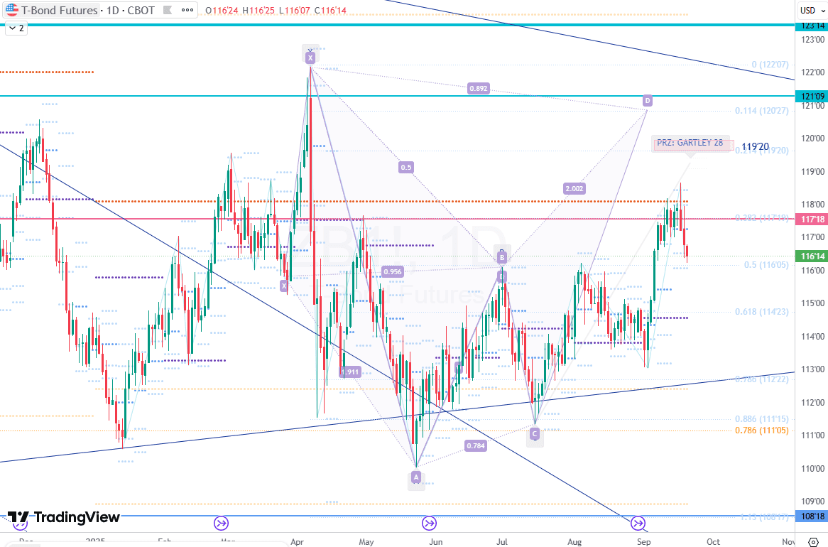 ゴールドは、前回シェアした$3,713の手前、$3,707あたりまで上昇してくれましたが、現在ここで、ベアリッシュなガートレーパターンが居座っています。ただし、ガートレーから、バットパターンに変化する可能性もあります。
