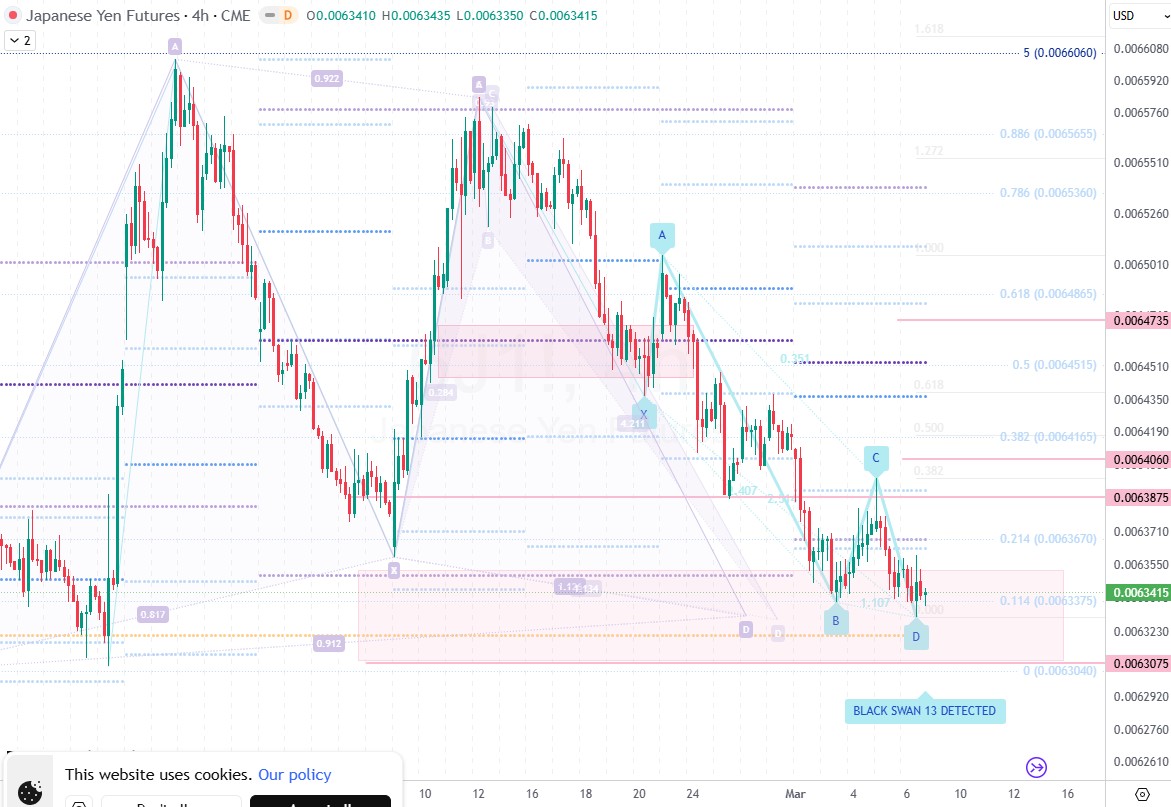 ポンド円とカナダドル円にバタフライパターンが居座っていますが、長期足のパターンであるのと、PRZ(潜在的反転ゾーン)がもう少し上ですので、直ぐには下げに転じなさそうです。円売りがもうちょっとだけ続くシナリオもオンなので、様子見ですね。EURJPYのキーレベルは186.100円あたり。2月7日の「フィボナッチ78.6%:ガートレーがいるDXY。そしてクロス円など」をご参照ください。