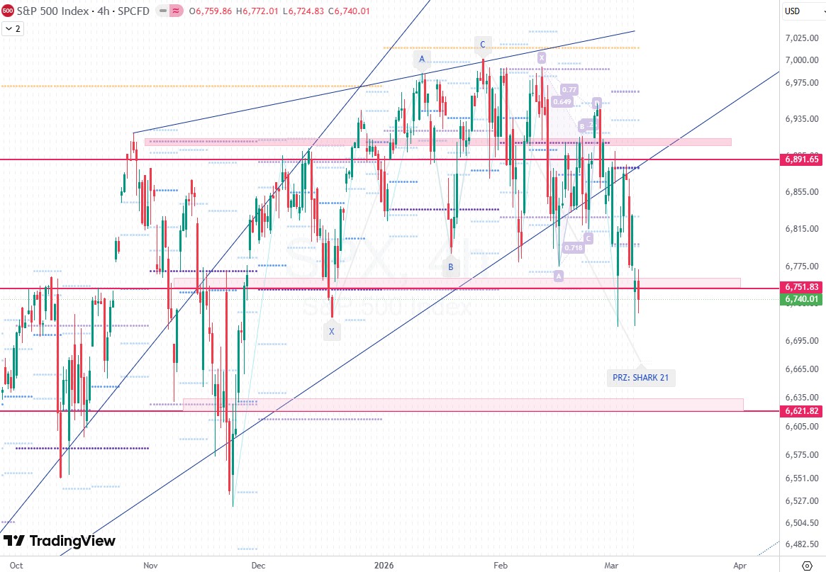 SPX 7 March 2026DJIなど株式指数ですが、キーとなるレジスタンスレベルには変わりないです。US500のキーレジスタンスは、$7,085あたりですが、果たしてここまで再び上昇してくるのか?