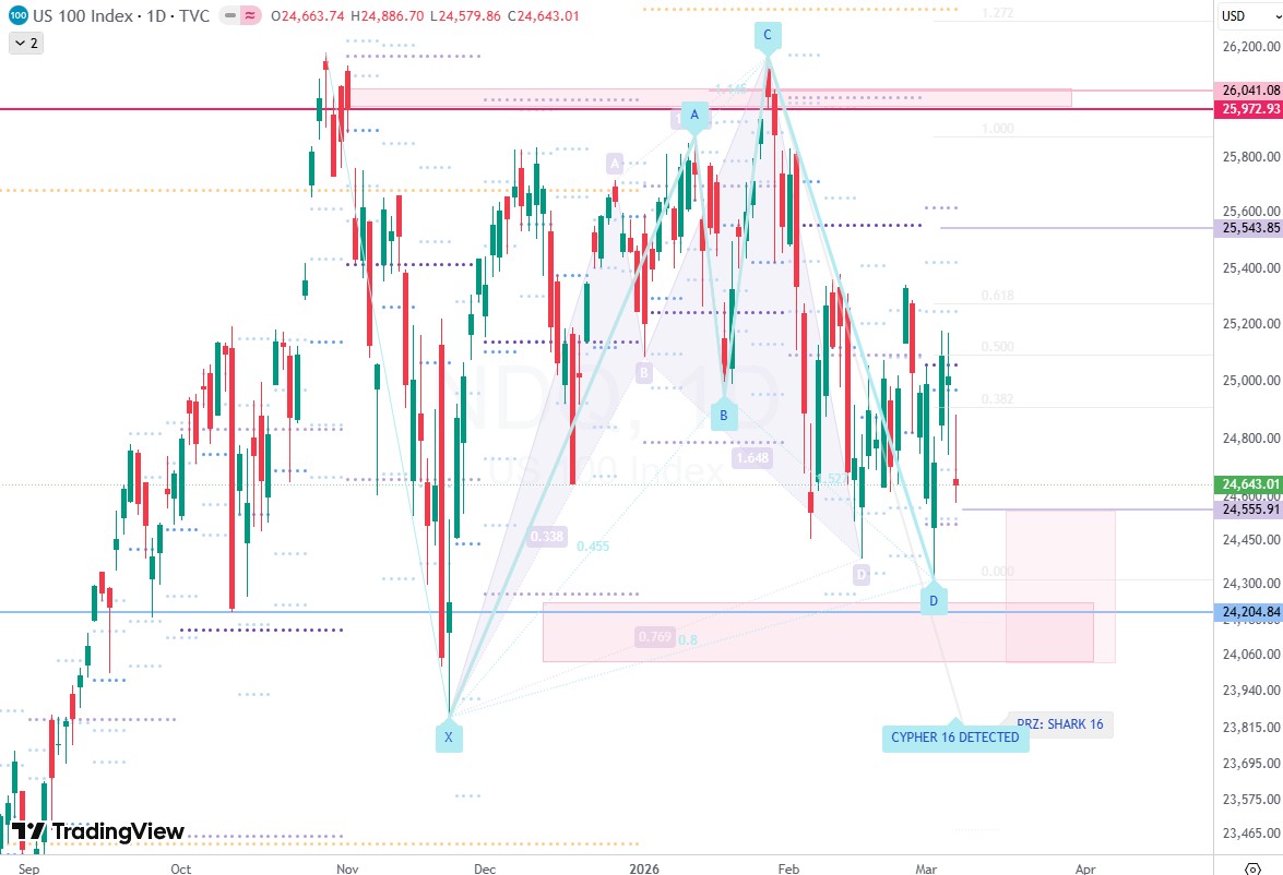 US 100 Index 7 March 2026US100も、窓を開けておりますが、まずは、一番上のピンクのボックスは、フィボナッチの「ザ・伸び切りゾーン」の上限。これが効いて、下げに転じてますよね。