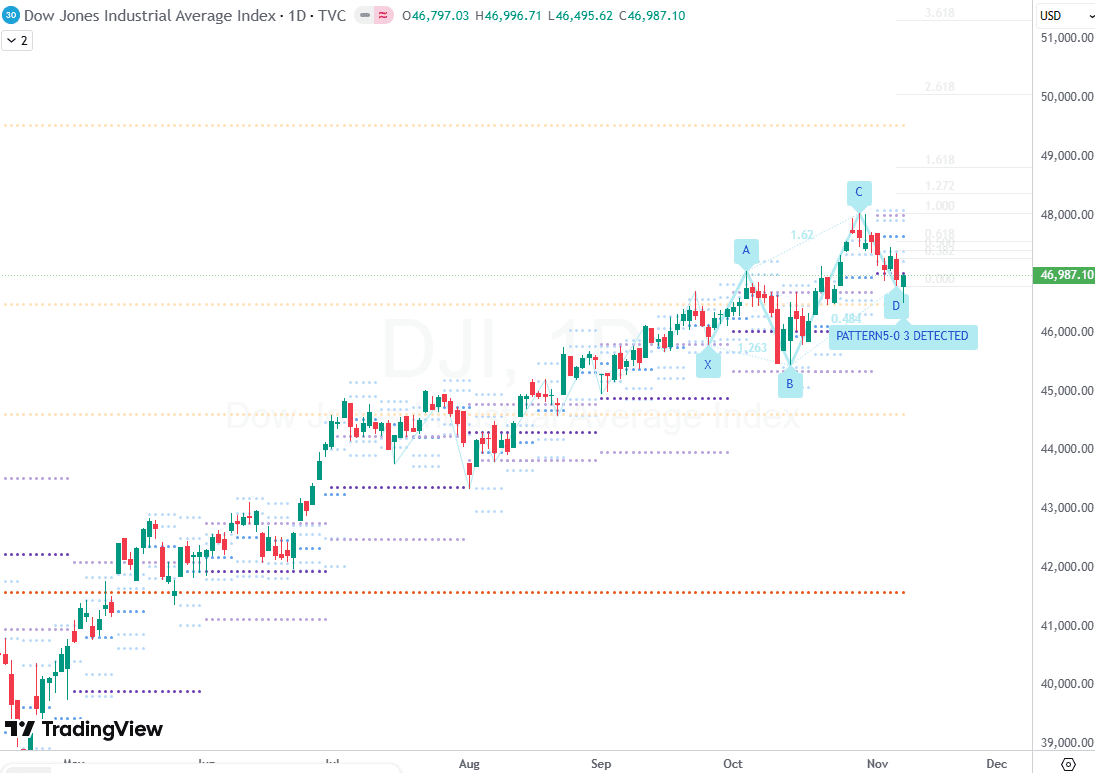 面白いのは、US30。すでにシェアしたように、週足にはベアリッシュなブラックスワンが居座っている環境です。そして、前回は、ベアリッシュな5-0パターンがいたので、下がったものの、現在は、ブリッシュな5-0パターンと年ピボットポイントR2のある$46,500あたりがサポートになっています。