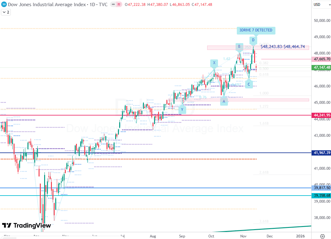 US30は、$48,243.83-$48,464.74が、フィボナッチから見える結構なレジスタンスエリア。今のところ、ガチで止められています。